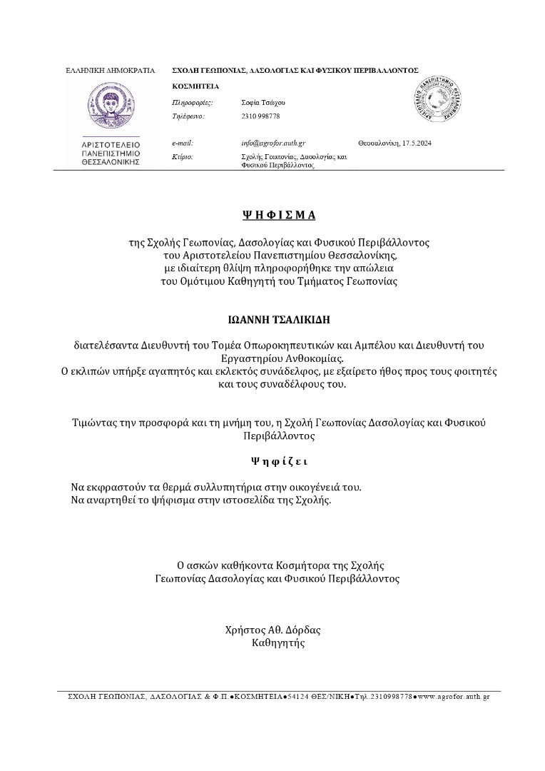 Ψήφισμα για την απώλεια του Ομότιμου Καθηγητή του Τμήματος Γεωπονίας Ιωάννη Τσαλικίδη