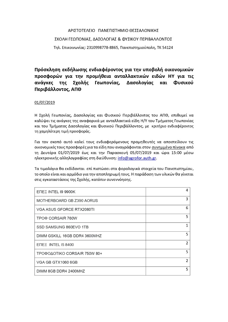 Αρχικη / Άλλα νέα / Πρόσκληση εκδήλωσης ενδιαφέροντος για την υποβολή οικονομικών προσφορών για την προμήθεια ανταλλακτικών ειδών ΗΥ για τις ανάγκες της Σχολής Γεωπονίας,