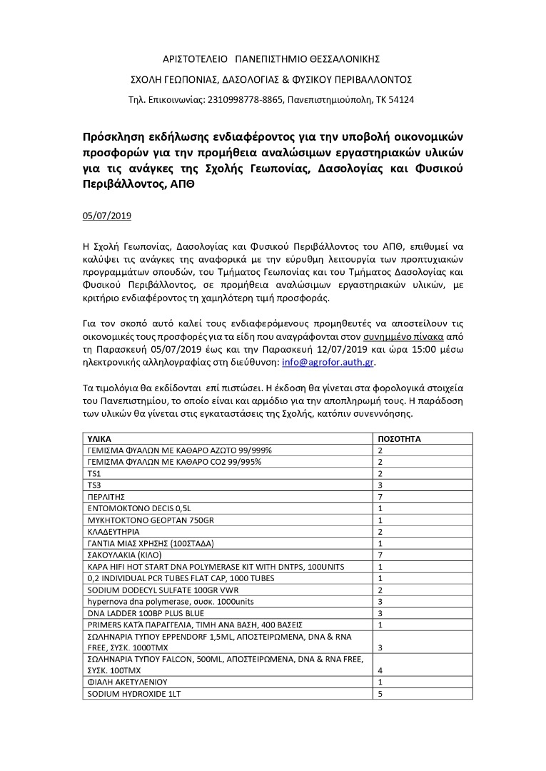 Πρόσκληση εκδήλωσης ενδιαφέροντος για την υποβολή οικονομικών προσφορών για την προμήθεια αναλώσιμων εργαστηριακών υλικών (Προπτυχιακών Σπουδών)