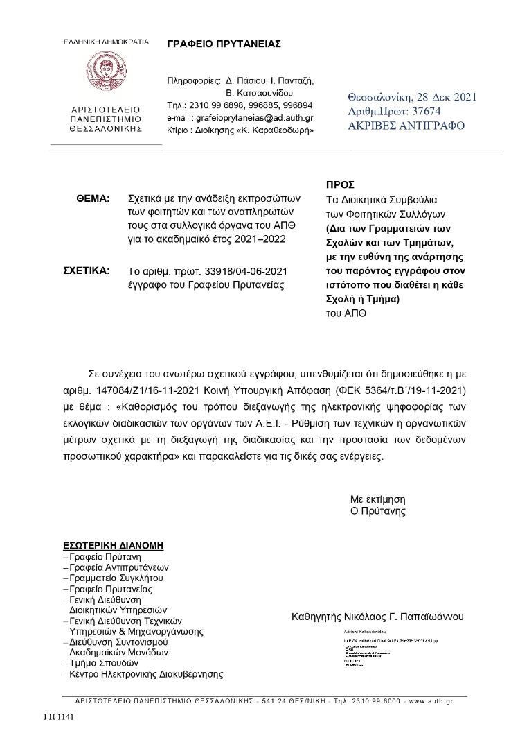 Σχετικά με την ανάδειξη εκπροσώπων των φοιτητών και των αναπληρωτών τους στα συλλογικά όργανα του ΑΠΘ για το ακαδημαϊκό έτος 2021–2022.